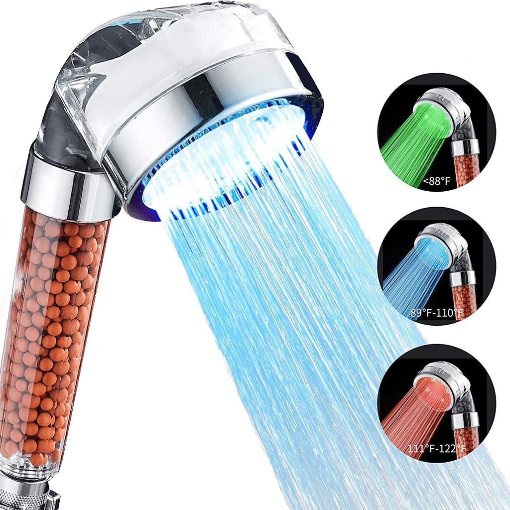 رأس الدش يعمل بالماء ولا يحتاج إلى بطاريات. يتغير لون مصابيح ليد مع درجة حرارة الماء (80 درجة فهرنهايت؛ 80-140 درجة فهرنهايت أزرق ؛ 100-122 درجة فهرنهايت أحمر)